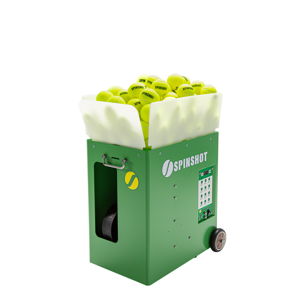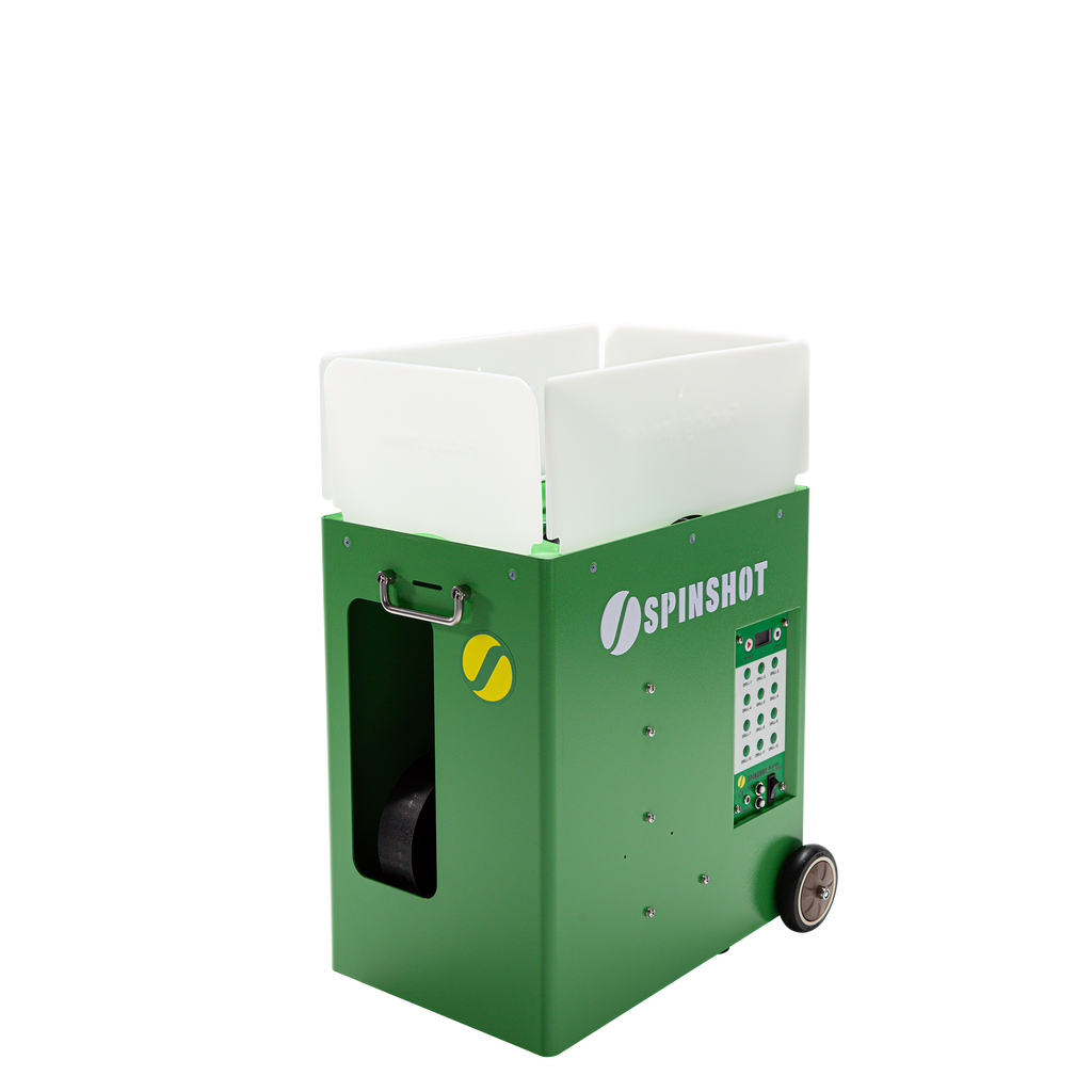 The Spinshot Player HS (high spin / high speed) tennis balls machines feature more powerful motors which allow for higher balls speeds even when top spin or back spin are used. The Spinshot Player HS top speed is around 80 mph and can be slowed don to 18 mph.